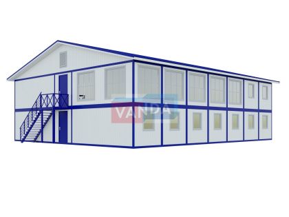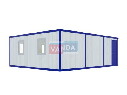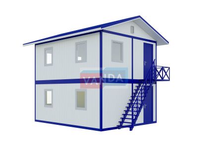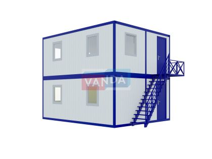 • многофункциональность использования. На первом этаже двухэтажного блок контейнера может располагаться пот охраны или пропускной пункт, а на втором этаже сам офис. Бытовка под офис может применяться не только для работы. Теплоизолирующие свойства пленки позволяют обустроить санузлы, душевые, раздевалки. Также можно часть здания использовать, как временную кухню или склад.
